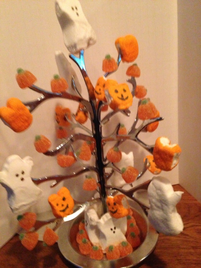 Couldn’t bring myself to buy a pumpkin while the temperature was in the 80s but now it’s starting to feel like fall. Livened up the gumdrop tree with Peeps this year!