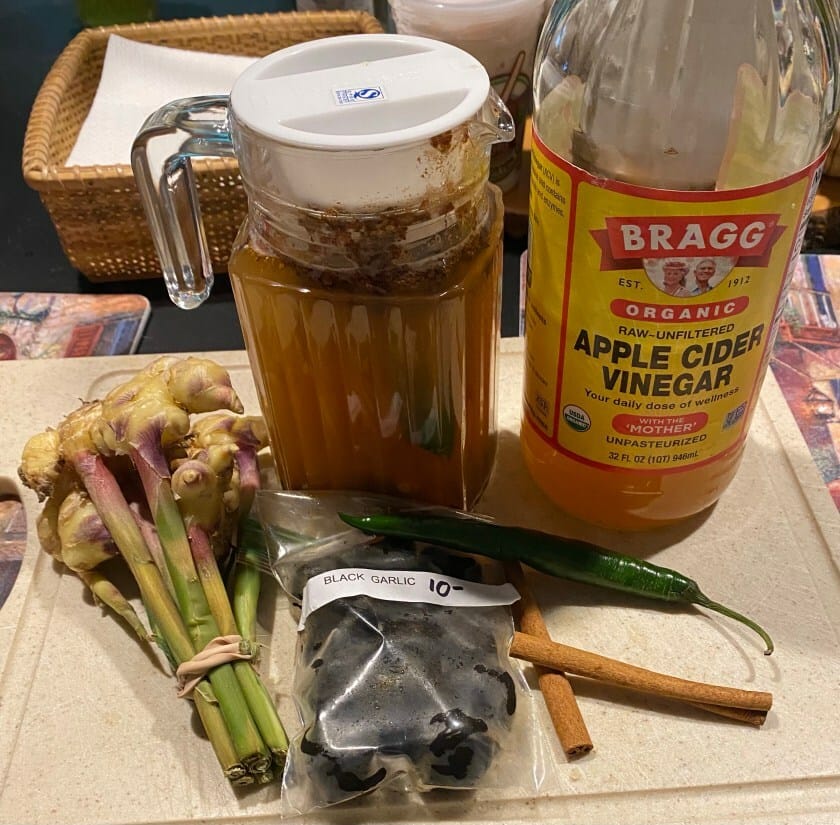 Here’s what I used – Unfiltered Apple Cider Vinegar, a stick of Cinnamon, A Whole Lemon, A Jalapeño pepper sliced open (for the fire), Red Onion chopped, Horseradish, Ginger & Garlic all diced.- I had black garlic from a farmer’s market, so I tried that – Some whole cloves and black peppercorn. I add powdered Turmeric as I have never found any fresh anywhere – You can also add a Sprig of Rosemary & Thyme if you have it.