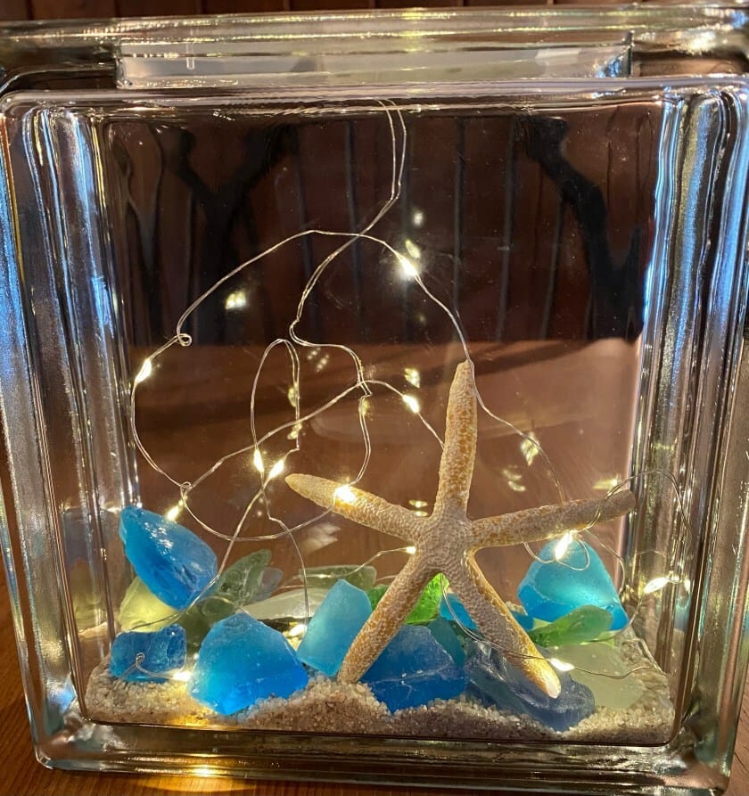 Look for glass bocks at craft stores – now they have a generous rectangular opening that closes with a plastic cover with a hole in the center to feed your lights through. I use so called firefly lights that are sold in 12 packs in a variety of colors – I prefer bright white. These lights have a low profile battery case that fits perfectly in the glass block plug – link below –