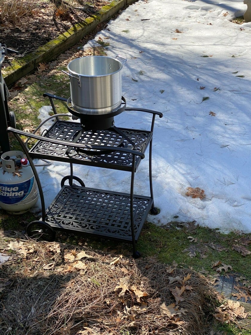 This year we are boiling the sap using a Turkey Fryer that we bought for this purpose and trying our hand at maple sugar candy as well – filter,filter,filter gives us the best results.