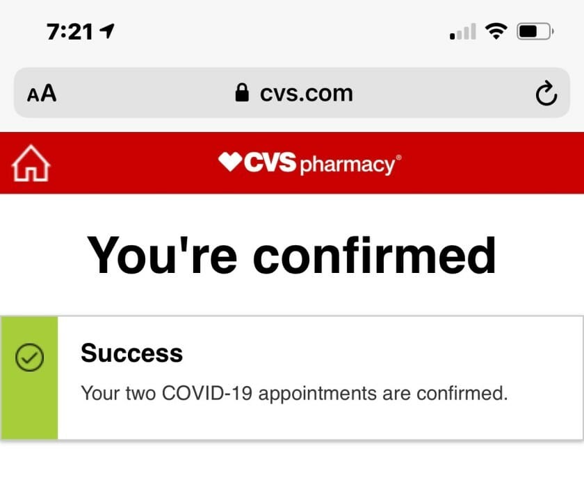 Finally found an appointment through CVS.COM. When I entered my ZIP Code it said there were no appointments available. When I just entered MA as an abbreviation for Massachusetts – a site popped up and I clicked and assume I snagged a cancellation. It’s funny to be this excited about getting a shot. For the first time in 11 months – I am feeling like I might be seeing light at the end of this tunnel.