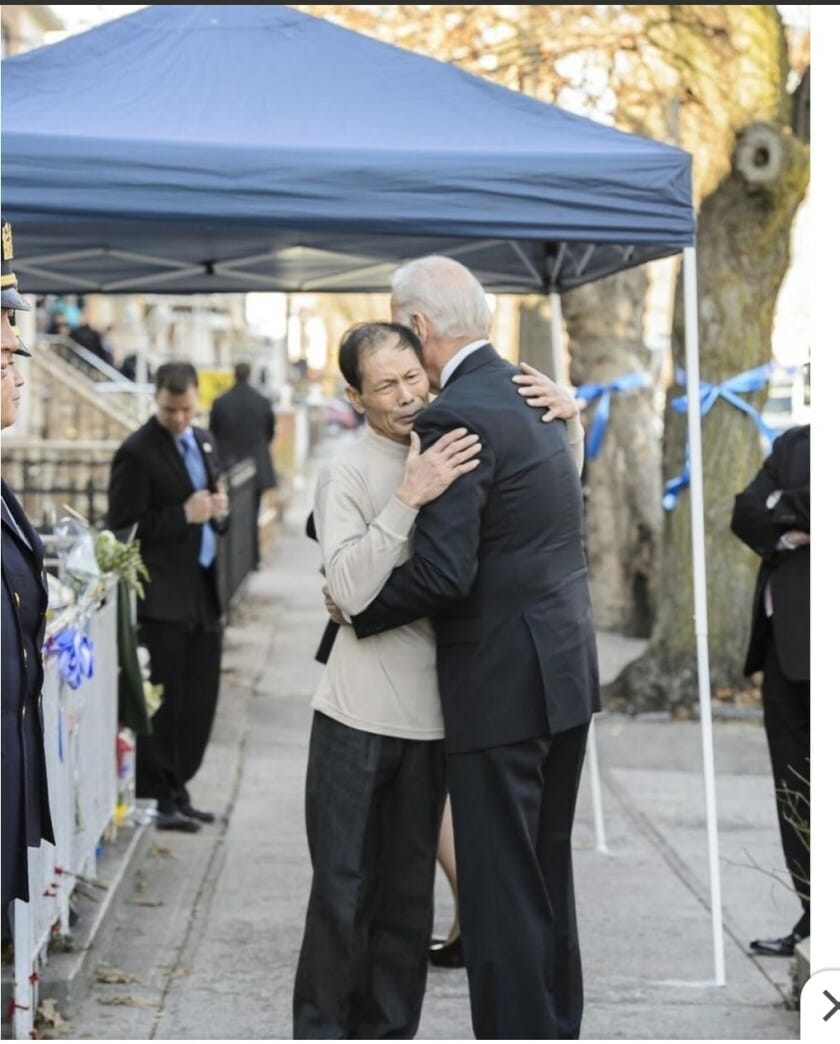 This is a photo of Joe Biden embracing the father of fallen NYC police officer Wenjiian Lui in 2014 on a Brooklyn sidewalk. The father did not speak English and just kept saying “Thank You”. Over and over again